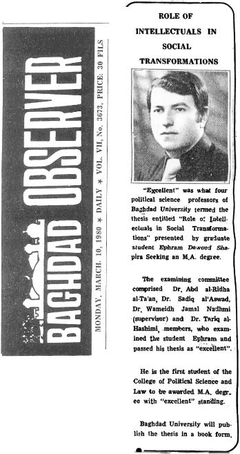 In 1971, he left the College of Arts to enroll in the College of Law and Political Science at Al - Mustansiriyah University in Baghdad. Attended evening classes and financed his education with a daytime job. In 1975, he graduated with high honors, receiving a BA in Political Science, ranking first in his college. In 1976, by reasons of his outstanding achievement at the BA degree level, was admitted in the College of Law and Political Science at Baghdad University for higher education (Master degree program) and on full time basis. In December 1979, completed M.A. requirements and submitted his thesis for master degree in political science. After five hours of oral argument, attended by a crowd of more that 200 attendants, half of them from Assyrian Cultural Club, four political science professors termed his thesis ”Excellent”. The title of the thesis was “ The Role of Intellectuals in Social Changes”, and the professors recommended its publication in a book form by Baghdad University. He was the first student of political science in Iraq to be awarded the M.A. degree “with excellent standing”. This occasioned news coverage of the event, alongside with his photo in local newspapers (See Baghdad Observer issue No. 3673 dated 10.03.1980 in the attached file: ads18 jpg) Contrary to the recommendation of the highest academic