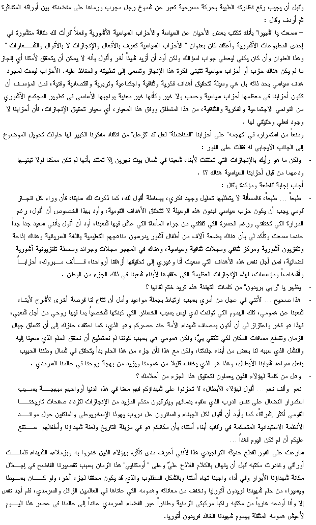 نحن الاشوريون بجميع طوائفنا ومذاهبنا دوما نعمل من أجل الحرية والسلام والرخاء. لكن حلمنا النهائي هو أن يكون لنا وطنا قوميا ونسميه ... آشـــور